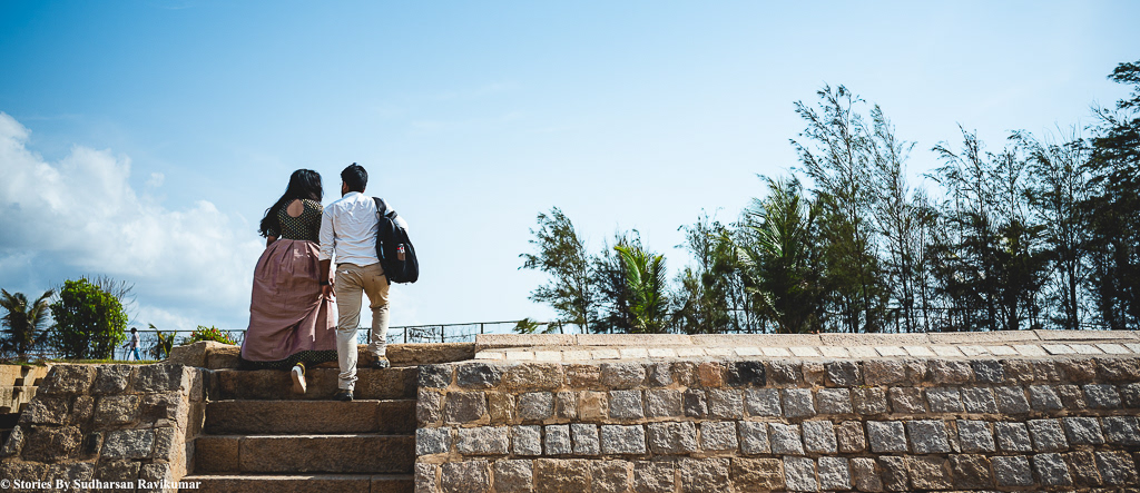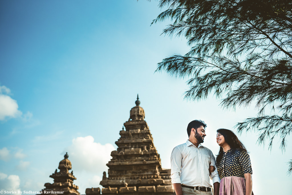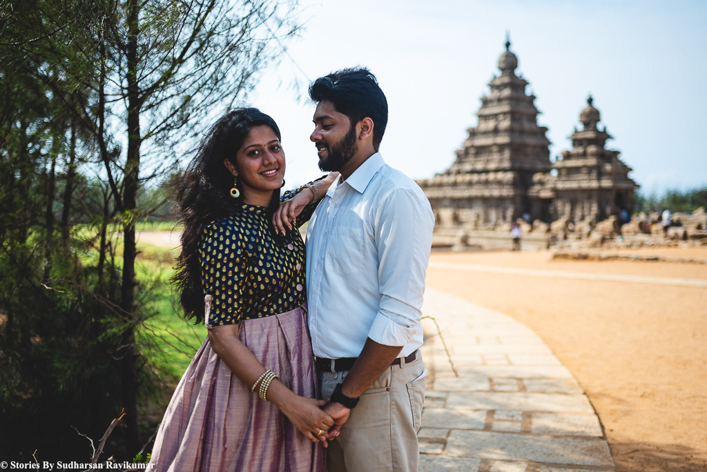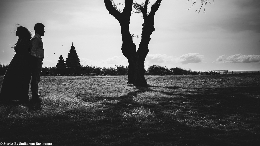 So for the past few days, I have been very busy and didn't even sleep for straight 3 days. Yesterday I had a couple shoot, i thought i will collapse anytime, I pinged everyone I knew to help on this shoot, Since i am in very bad health condition but everyone was busy, So i decided to ask my wife to help in this shoot, On Saturday night i was in a shoot it got over by early morning 5am, I started from there and reached shore temple by 6am, Meanwhile my wife Yuganya Sudharsan packed all the cameras and lenses previous night and she was there in shore temple by 6:10 am, I was drowsy and sleepy, she walked throughout the shore temple and composed several photos and started shooting, She was very strict with the couple dressing and accessories, She told me one thing, don't try too hard, just talk to them and frame it simple.